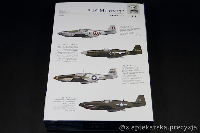 As you can see there are six marking variants including two bonus ones. Unfortunately I can't find differences betwen third and fifth scheme. The proposed schemes are so attractive that it will be hard to decide which one to choose. In my opinion this is the biggest advantage of this kit, and this is not the only one. Those who remember the review of the P-51B/C probably agree that Mustang made by Arma Hobby has almost only advantages.